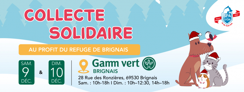 Soutenez la cause animale en participant à la collecte alimentaire organisée au magasin GAMM VERT Brignais samedi 9 et dimanche 10 décembre 2023. Nos bénévoles vous accueillent à l’entrée du magasin pour récolter vos dons pour les animaux du refuge de Brignais (chiens, chats et nouveaux animaux de compagnie).